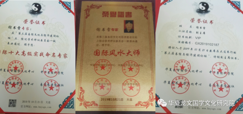 2019年10月,受邀以大会副主席身份出席第三届易经文化与经济建设论坛,被授予“国际十大高级实战命名专家”,“国际风水大师”荣誉证书;