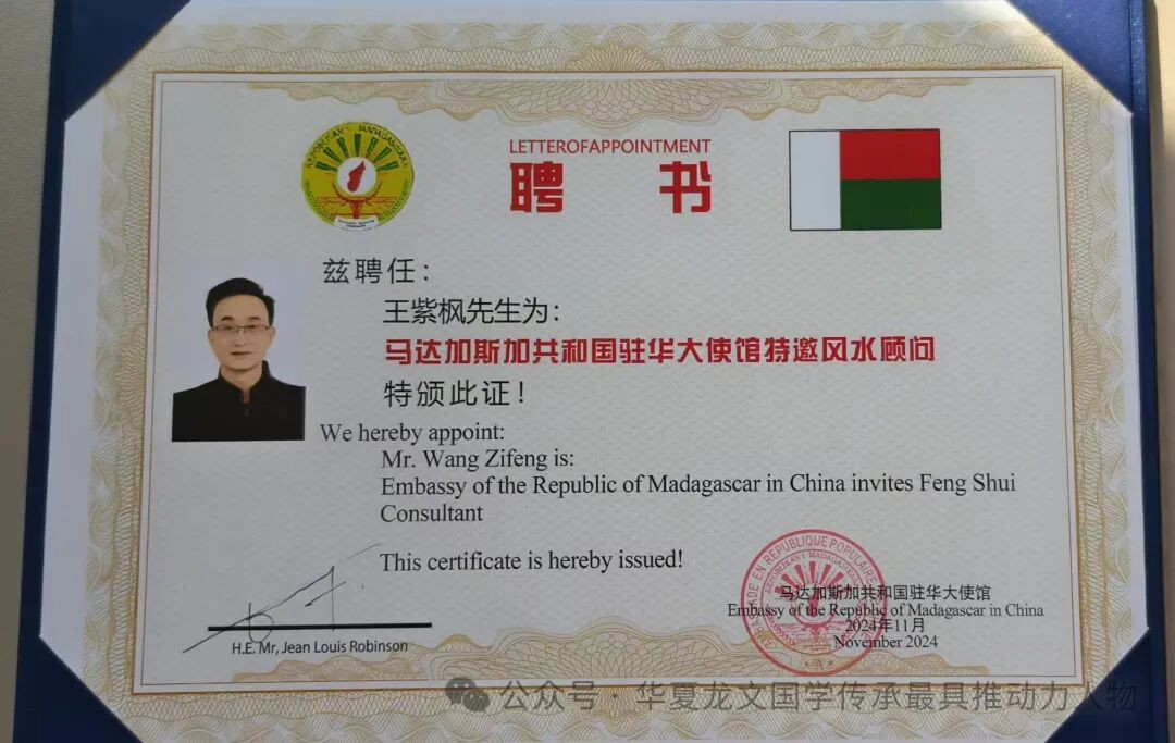 王紫枫上海紫祥堂文化创始人,现任中国易经研究学会(香港公司)合肥分会长,上海周易网络学院客座教授,马达加斯加共和国驻华大使馆风水顾问,喀麦隆驻华大使馆国学文化顾问,北京华夏易缘国学院高级风水师,道家闾山派修真文化传承人,道家骊山法脉传承人。这些重要身份不仅展示了他的专业实力,也使他在易学和传统文化领域拥有了一定的影响力。